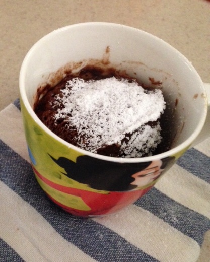 Ανακατεύουμε με το κουτάλι όλα τα υλικά σε μια κούπα καφέ και ψήνουμε στο φούρνο μικροκυμάτων (στην μέγιστη ένταση) για 2′. Μόλις κρυώσει λίγο πασπαλίζουμε με ζάχαρη άχνη (αν θέλουμε) και το τρώμε επί τόπου!
